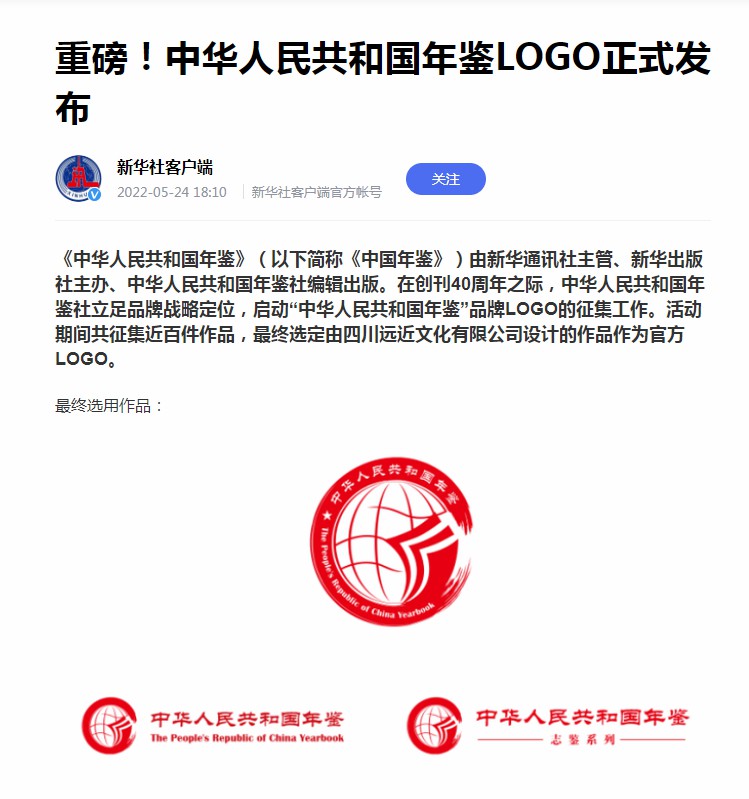 《中华人民共和国年鉴》(以下简称《中国年鉴》)是由新华通讯社主管、新华出版社主办、中华人民共和国年鉴社编辑出版。2022年《中国年鉴》创刊40周年之际,中华人民共和国年鉴社立足品牌战略定位,启动“中华人民共和国年鉴”品牌LOGO的征集工作。活动期间共征集近百件作品,最终选定由四川远近文化有限公司设计的作品作为官方LOGO。