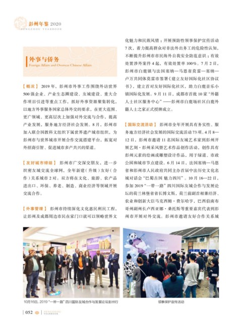 【概况】 2019 年,彭州市外事工作围绕外访世界 书》,建立首对友好国际化社区,助力白鹿音乐小