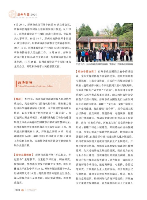 【概况】 2019 年,彭州市政协准确把握人民政协性 校落户天府中药城。彭州市政协围绕龙门山前江河