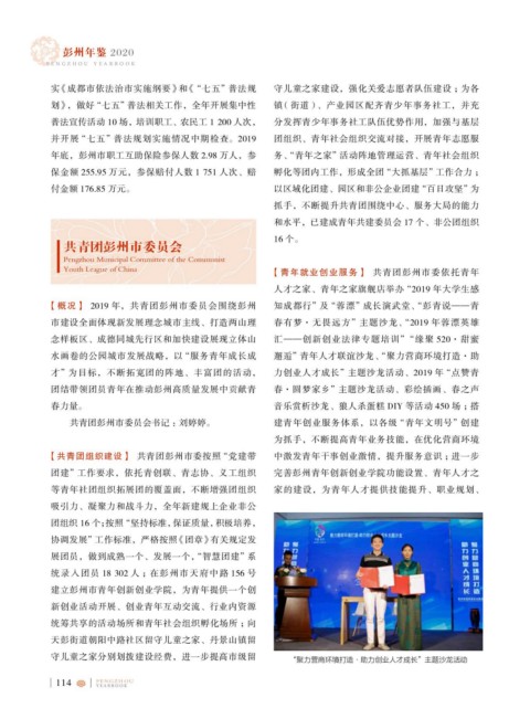 【概况】 2019 年,共青团彭州市委员会围绕彭州 知成都行”及 “蓉漂”成长演武堂、“彭青说——青
