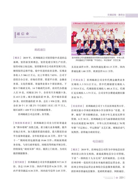 【报刊邮发】 彭州邮政公司全年投递报纸 917.16 万 彭州市唯一党组织关系在本地的通信运营企业,是