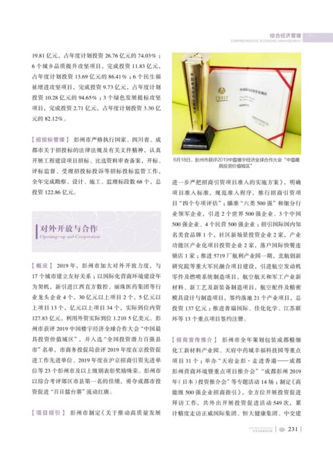 【概况】 2019 年,彭州市加大对外开放力度,与 研究院等重大军民融合项目建设,引进航空发动机