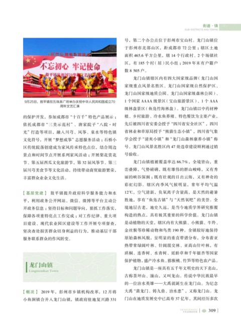 【概况】 2019 年,彭州市乡镇机构改革,12 月将 大禹 “凿龙门、铸九鼎、治水患” ,又称龙门山。龙