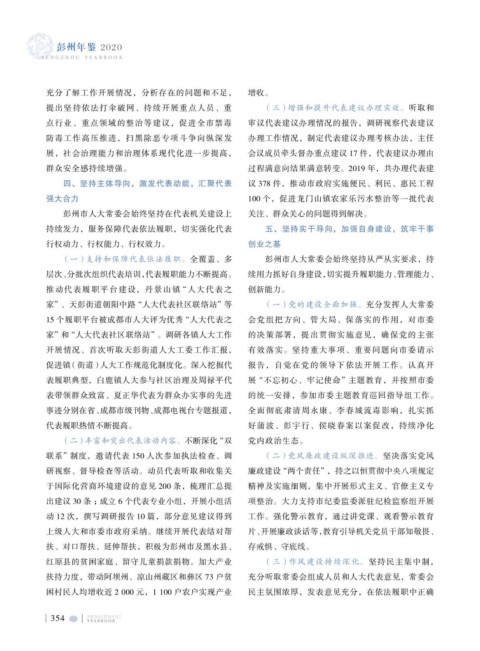 (一)支持和保障代表依法履职。全覆盖、多 彭州市人大常委会始终坚持从严从实要求,持 表大会制度特等奖、第 28 届省人大新闻三等奖,充 习贯彻党的十九届四中全会精神,深刻把握坚持和