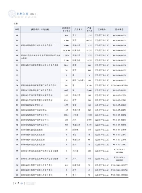 20 彭州市敖平镇紫泉蔬菜种植农民专业合作社 21.01 菠菜 300 无公害产品认证 WGH-14-06031