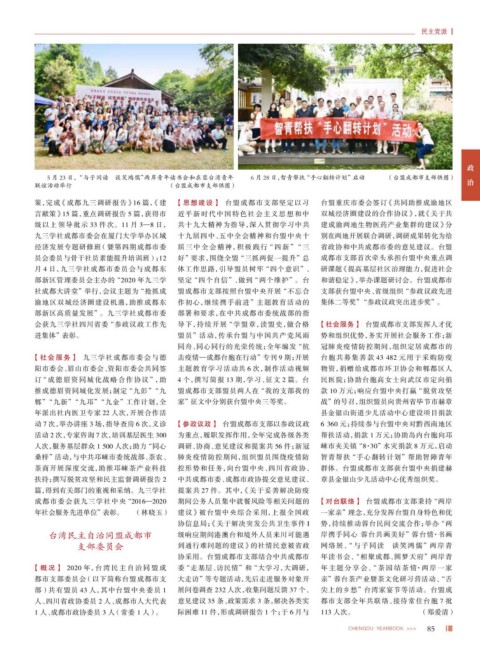 推成德眉资同城化发展;制定 “九彭” “九 盟成都市支部盟员两人在 “我的支部我的 款 10 万元;响应台盟中央打赢 “脱贫攻坚