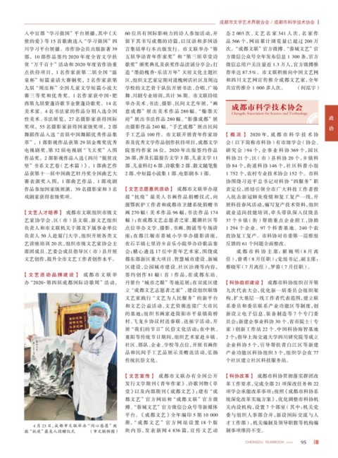 舞蹈作品入选 “首届中国舞蹈优秀作品集 手工艺品 100 件。市文联开展青年作家培 【概况】 2020 年,成都市科学技术协