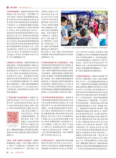 【创新助力工程实施】 成都市科协加大科 【中国科协海智计划工作基地建设】 成都 行论坛、100 多个线上学术论坛和 9 个专