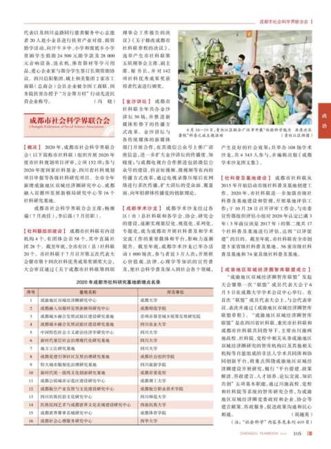会 (以下简称市社科联)组织开展 2020 年 座信息,进一步扩大金沙讲坛的传播度、知 沙龙,共 4 343 人参与,并编辑出版 《成都