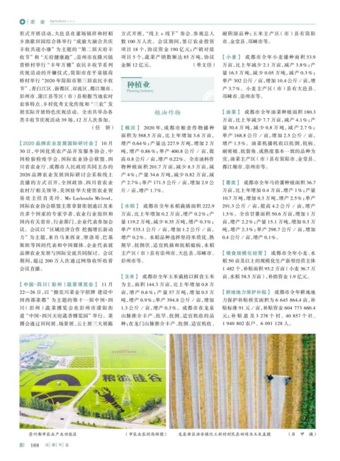 (任 妍) 【概况】 2020 年,成都市粮食作物播种 量 30.4 万 吨,减 少 0.8 万 吨,减 产 2.7 %;