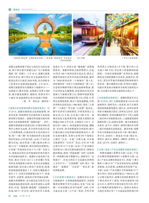 游消费示范城市。成都市形成独具城市特 都市优化文旅消费环境,建成文创园区面 二批全国乡村旅游重点村,入选数量居副省