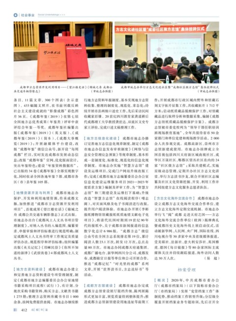 化,同时收录全国各地年鉴 7 部、成都市各 作;完成 《成都市地方志编纂委员会办公室 堂、举行方志读书沙龙,联合开展社区志编