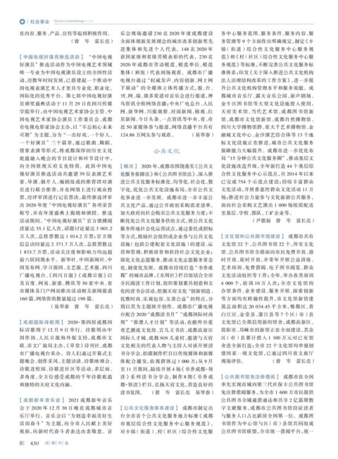 向全国展现天府文化特质。此届中国电 【概况】 2020 年,成都市围绕落实 《公共文 化设施改造升级,全年新打造 44 个基层综