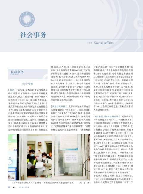 【概况】 2020 年,成都市民政局围绕基层 织参与新冠肺炎疫情防控工作进行深入调 革社会组织年检工作,首次在社会组织信