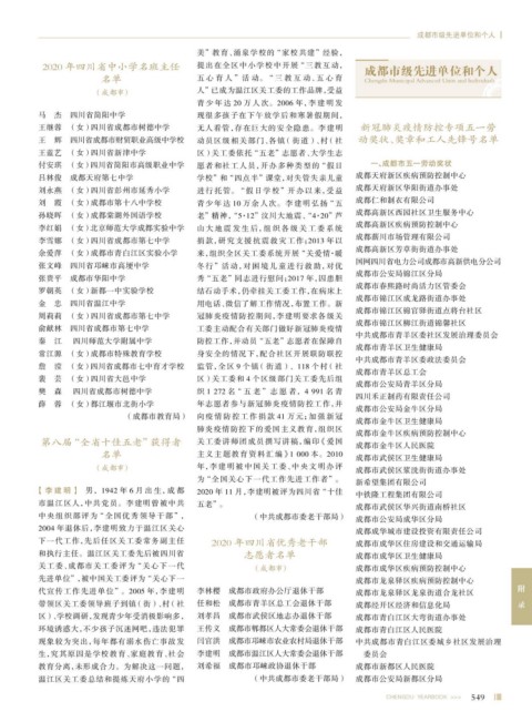 2020 年四川省中小学名班主任 提出在全区中小学校中开展 “三教互动, 成都市级先进单位和个人