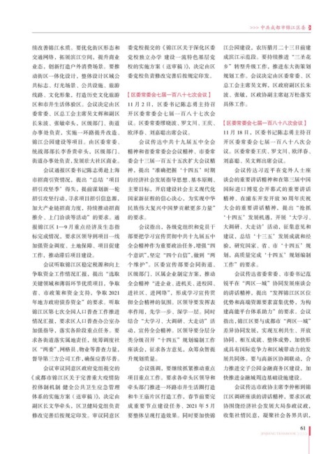 省、市政策和资金支持,争取 2021 进社区、进网络”,形成学习宣传贯 的讲话精神,提出“发挥锦江区区位