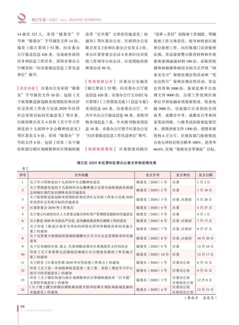 号和“锦委办”字号制发文件 14 份, 通知》等区委办公室、区政府办公室 保密工作主体责任,指导和检查区级