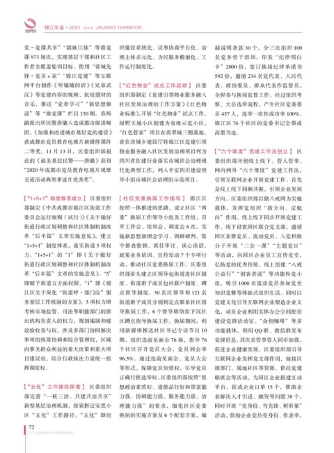 即赋予街道五方面权限。“1”即《锦 度、街道班子成员包社联户制度、蹲 组,吸引 1000 名流动党员参加党史
