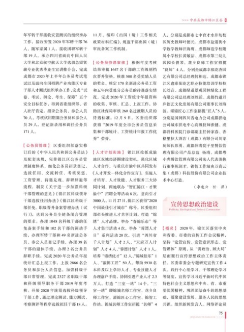 辞职手续。完成 2020 年公务员年报 培养“锦绣优才”12 人、“锦城伯乐”1 层面履行宣传思想政治工作主体责