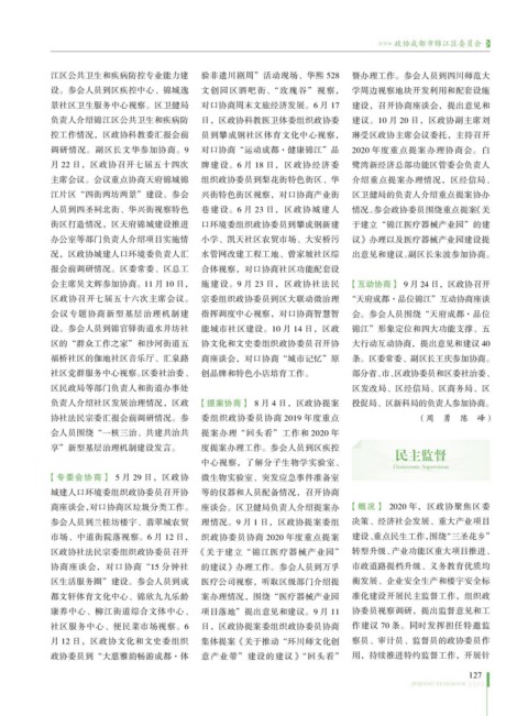 调研情况。副区长文华参加协商。9 对口协商“运动成都·健康锦江”品 2020 年度重点提案办理协商会。白