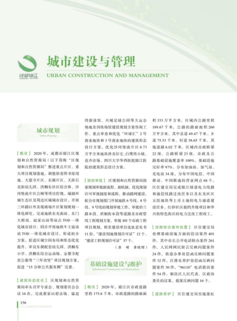 【概况】 2020 年,成都市锦江区规 万平方米地块涉及住宅、白鹭湾小镇、 22 座、公路桥梁 23 座。市政及公