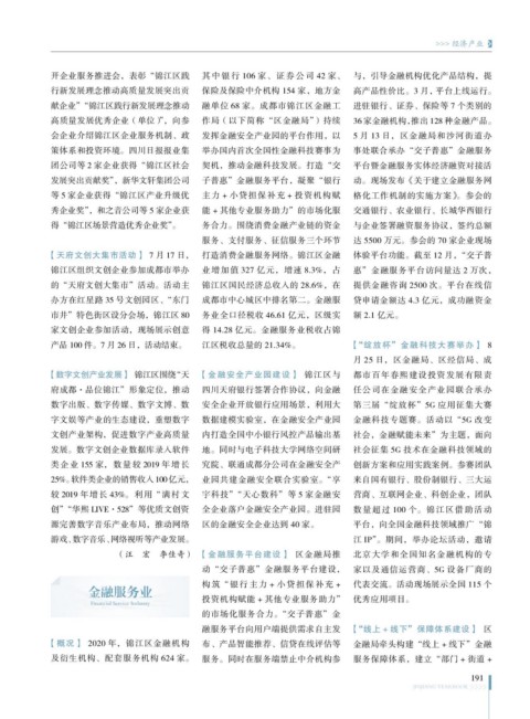 【概况】 2020 年,锦江区金融机构 布、产品智能推荐、信贷在线评估等 金融局牵头构建“线上 + 线下”金融