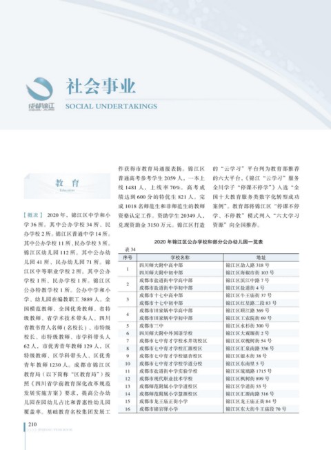 其中公办学校 11 所、民办学校 3 所。 2020 年锦江区公办学校和部分公办幼儿园一览表