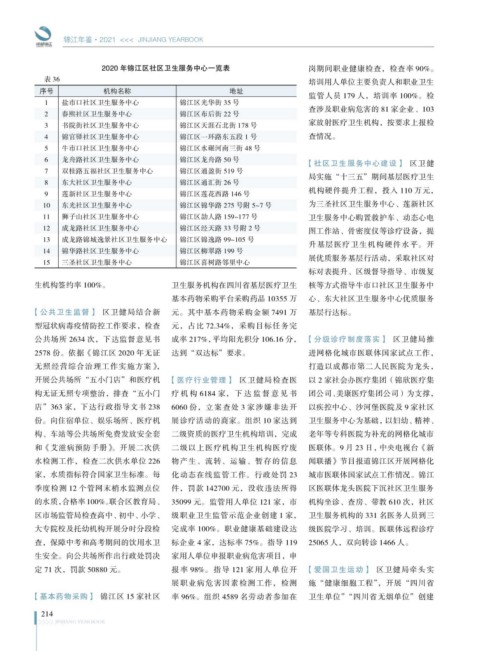 2020 年锦江区社区卫生服务中心一览表 岗期间职业健康检查,检查率 90%。