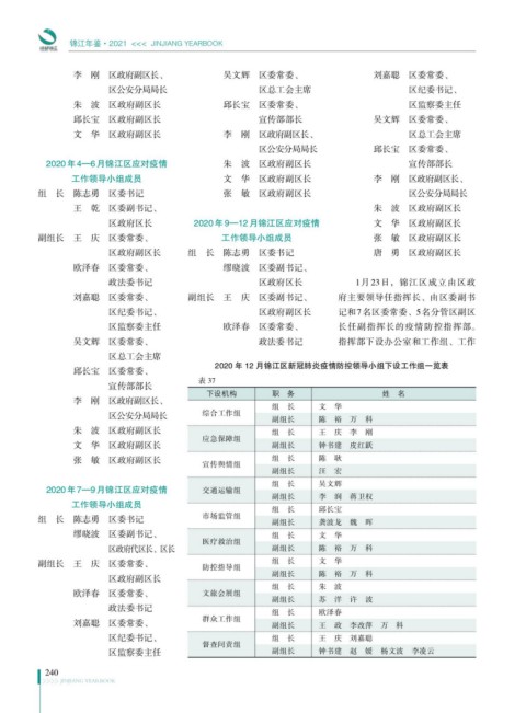 2020 年 12 月锦江区新冠肺炎疫情防控领导小组下设工作组一览表