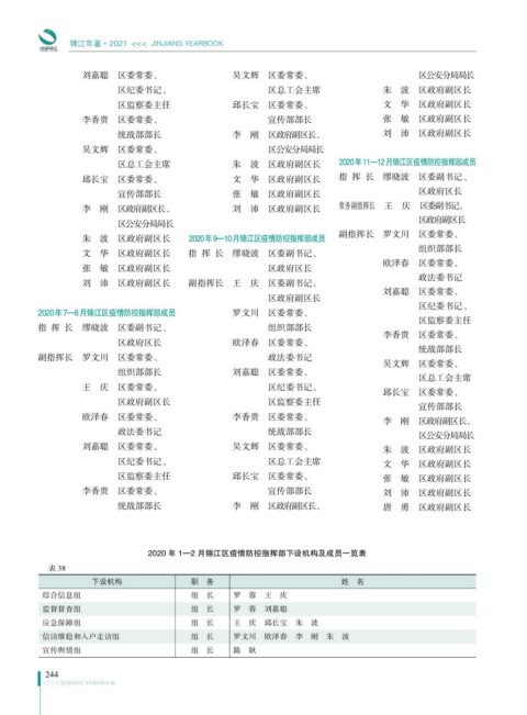 2020 年 1—2 月锦江区疫情防控指挥部下设机构及成员一览表