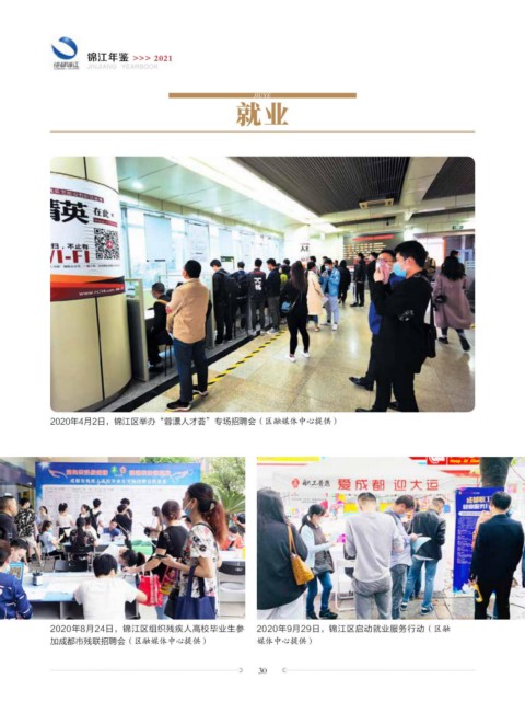 锦江年鉴 >>> 2021 JINJIANG YEARBOOK JIUYE 就业 2020年4月2日,锦江区举办“蓉漂人才荟”专场招聘会(区融媒体中心提供) 2020年8月24日,锦江区组织残疾人高校毕业生参 2020年9月29日,锦江区启动就业服务行动(区融 加成都市残联招聘会(区融媒体中心提供) 媒体中心提供) 30