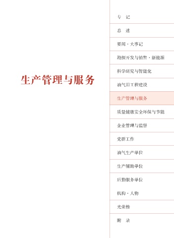专 记 总 述 要闻·大事记 勘探开发与销售·新能源 科学研究与智能化 生产管理与服务 油气田工程建设 生产管理与服务 质量健康安全环保与节能 企业管理与监督 党群工作 油气生产单位 生产辅助单位 后勤服务单位 机构·人物 光荣榜 附 录
