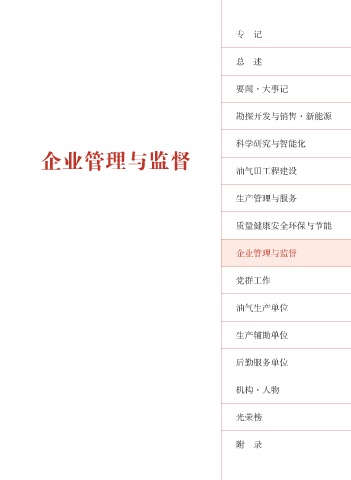 专 记 总 述 要闻·大事记 勘探开发与销售·新能源 科学研究与智能化 企业管理与监督 油气田工程建设 生产管理与服务 质量健康安全环保与节能 企业管理与监督 党群工作 油气生产单位 生产辅助单位 后勤服务单位 机构·人物 光荣榜 附 录