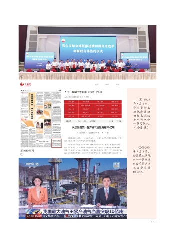 ① ① 2024 年8 月4 日, 鄂 尔多 斯 盆 地 低渗 透 油 田 提高 采 收 率 创新 联 合 体签约仪式。 (刘娟 摄) ②③ 2024 年9月3日, ② 全国最大油气 田——长庆油 田公司累产油 气当量突破 10 亿吨。 ③ ·3·