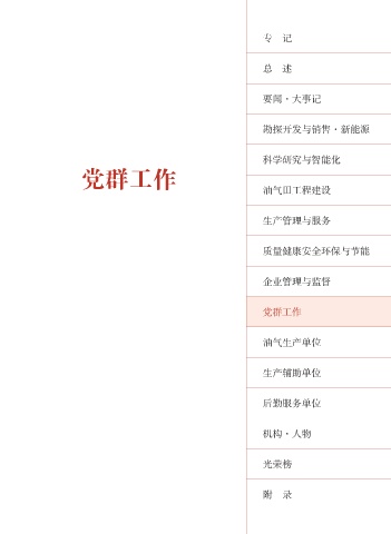专 记 总 述 要闻·大事记 勘探开发与销售·新能源 科学研究与智能化 党群工作 油气田工程建设 生产管理与服务 质量健康安全环保与节能 企业管理与监督 党群工作 油气生产单位 生产辅助单位 后勤服务单位 机构·人物 光荣榜 附 录