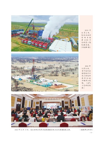 2024 年 11月 2日, 陕北石油评 价项目组 黄 89H 平 台前置二氧 化 碳 压 裂。 (孙海峰 摄) 2024 年 12月16日, 首个氢代油 绿色钻井示 范工程乌审 旗 靖 32-40 井场开工现 场。 (油气 工艺研究院 供) 2024 年 12 月 19 日,长庆油田公司举办首届勘探系统工业化制图技能大赛。 (勘探事业部 供) ·5·