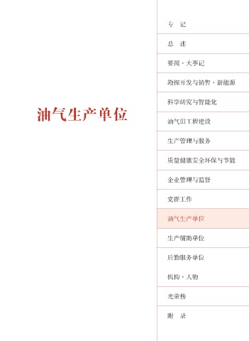专 记 总 述 要闻·大事记 勘探开发与销售·新能源 科学研究与智能化 油气生产单位 油气田工程建设 生产管理与服务 质量健康安全环保与节能 企业管理与监督 党群工作 油气生产单位 生产辅助单位 后勤服务单位 机构·人物 光荣榜 附 录