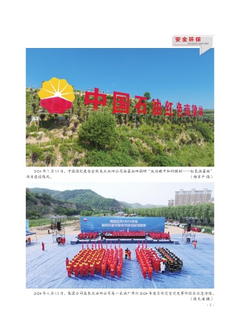 安 全 环 保 AN QUAN HUAN BAO 2024 年 7 月 10 日,中国绿化基金会到长庆油田公司南梁油田调研“我为碳中和种棵树——红色南梁林” 项目建设情况。 (杨军平 摄) 2024 年 6 月 13 日,集团公司在长庆油田公司第一采油厂举行 2024 年度自然灾害突发事件综合应急演练。 (张天涌 摄) ·7·
