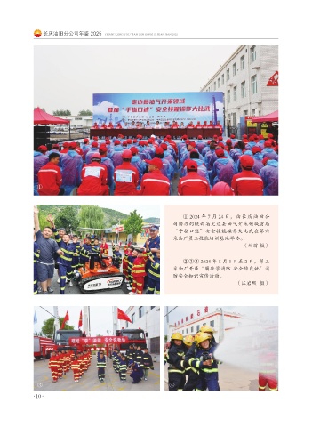 长庆油田分公司年鉴 2025 CHANG QING YOU TIAN FEN GONG SI NIAN JIAN 2025 ① ① 2024 年 7 月 24 日,由长庆油田公 司协办的陕西省定边县油气开采领域首届 “手指口述”安全技能操作大比武在第六 采油厂员工技能培训基地举办。 (刘前 摄) ②③④2024年8月1日至2日,第三 采油厂开展“萌娃学消防 安全你我他”消 防安全知识宣传活动。 (汪岩熙 摄) ② ③ ④ ·10·