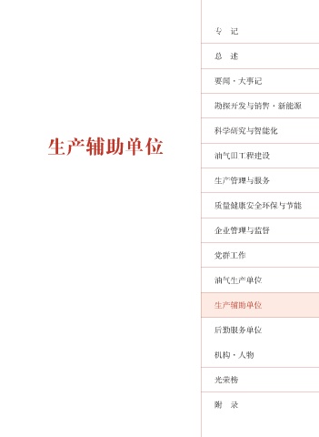 专 记 总 述 要闻·大事记 勘探开发与销售·新能源 科学研究与智能化 生产辅助单位 油气田工程建设 生产管理与服务 质量健康安全环保与节能 企业管理与监督 党群工作 油气生产单位 生产辅助单位 后勤服务单位 机构·人物 光荣榜 附 录