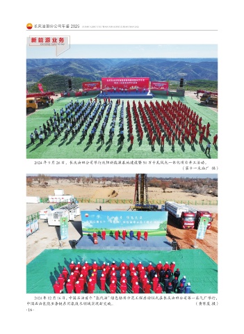 长庆油田分公司年鉴 2025 CHANG QING YOU TIAN FEN GONG SI NIAN JIAN 2025 新 能 源 业 务 XIN NENG YUAN YE WU 2024 年 9 月 26 日,长庆油田公司举行庆阳新能源基地建设暨 50 万千瓦风光一体化项目开工活动。 (第十一采油厂 供) 2024 年 12 月 16 日,中国石油首个“氢代油”绿色钻井示范工程启动仪式在长庆油田公司第一采气厂举行, 中国石油氢能业务链在用氨技术领域实现新突破。 (黄陈晨 摄) ·16·