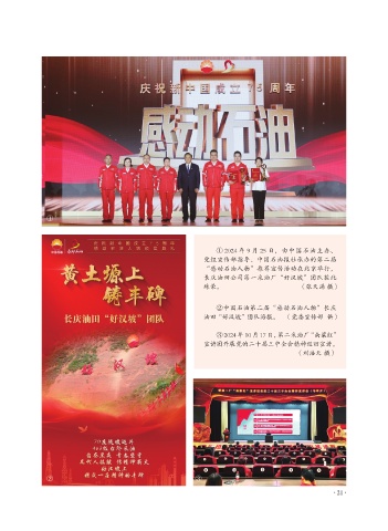 ① ① 2024 年 9 月 25 日,由中国石油主办、 党组宣传部指导、中国石油报社承办的第二届 “感动石油人物”推荐宣传活动在北京举行, 长庆油田公司第一采油厂“好汉坡”团队获此 殊荣。 (张天涌 摄) ②中国石油第二届“感动石油人物”长庆 油田“好汉坡”团队海报。 (党委宣传部 供) ③ 2024 年 10 月 17 日,第二采油厂“南梁红” 宣讲团开展党的二十届三中全会精神巡回宣讲。 (刘浩天 摄) ② ③ ·21·