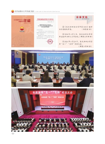 长庆油田分公司年鉴 2025 CHANG QING YOU TIAN FEN GONG SI NIAN JIAN 2025 企 业 文 化 QI YE WEN HUA ①《长庆油田分公司年鉴 2023》被评 为全国特优年鉴。 (档案馆 供) ② 2024 年 4 月 2 日,长庆油田公司召 开 2024 年女职工工作会议。(群团工作部 供) ③ 2024 年 4 月 29 日,长庆油田公司召 开“五一”“五四”纪念大会。 ① (群团工作部 供) ② ③ ·22·