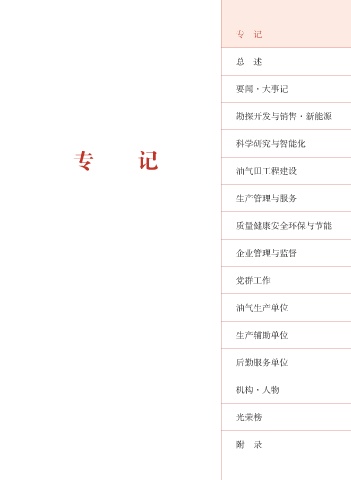专 记 总 述 要闻·大事记 勘探开发与销售·新能源 科学研究与智能化 专 记 油气田工程建设 生产管理与服务 质量健康安全环保与节能 企业管理与监督 党群工作 油气生产单位 生产辅助单位 后勤服务单位 机构·人物 光荣榜 附 录