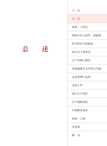 专 记 总 述 要闻·大事记 勘探开发与销售·新能源 科学研究与智能化 总 述 油气田工程建设 生产管理与服务 质量健康安全环保与节能 企业管理与监督 党群工作 油气生产单位 生产辅助单位 后勤服务单位 机构·人物 光荣榜 附 录
