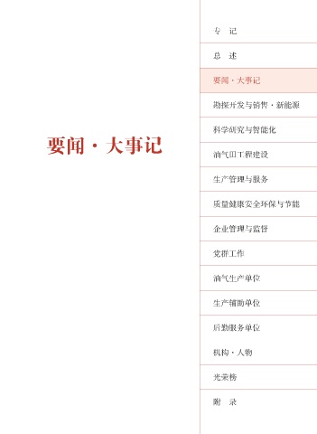 专 记 总 述 要闻·大事记 勘探开发与销售·新能源 科学研究与智能化 要闻·大事记 油气田工程建设 生产管理与服务 质量健康安全环保与节能 企业管理与监督 党群工作 油气生产单位 生产辅助单位 后勤服务单位 机构·人物 光荣榜 附 录