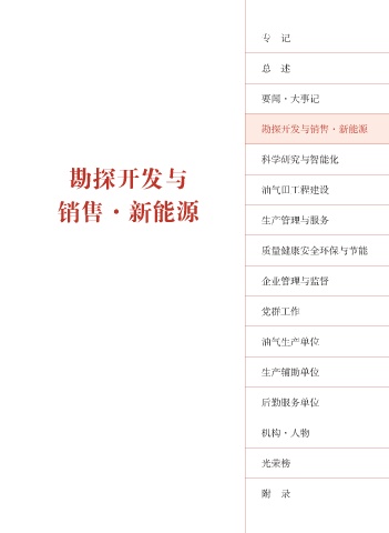 专 记 总 述 要闻·大事记 勘探开发与销售·新能源 科学研究与智能化 勘探开发与 油气田工程建设 销售·新能源 生产管理与服务 质量健康安全环保与节能 企业管理与监督 党群工作 油气生产单位 生产辅助单位 后勤服务单位 机构·人物 光荣榜 附 录