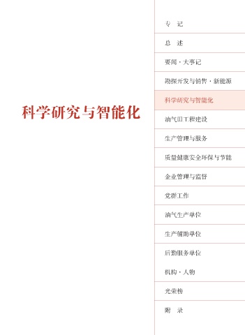 专 记 总 述 要闻·大事记 勘探开发与销售·新能源 科学研究与智能化 科学研究与智能化 油气田工程建设 生产管理与服务 质量健康安全环保与节能 企业管理与监督 党群工作 油气生产单位 生产辅助单位 后勤服务单位 机构·人物 光荣榜 附 录