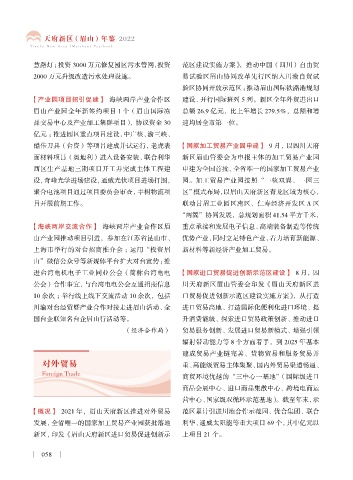 【概况】 2021 年,眉山天府新区推进对外贸易 范区累计引进川港合作示范园、优合集团、联合