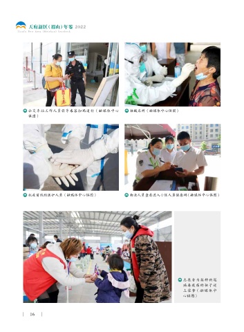 天府新区(眉山)年鉴 2022 Ti a n f u Ne w A r e a (M e i s h a n) Ye a r b o ok 公交车站工作人员引导乘客扫码通行(融媒体中心 核酸采样(融媒体中心供图) 供图) 抗疫前线的医护人员(融媒体中心供图) 物业人员查看进入小区人员健康码(融媒体中心供图) 志愿者为接种新冠 病毒疫苗的孩子送 上零食(融媒体中 心供图) 16